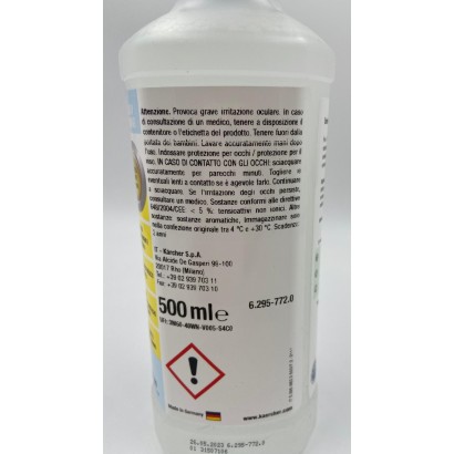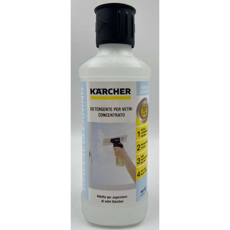 Detergente vetri concentrato, Karcher RM 500 può essere utilizzato per la pulizia di finestre, vetrate, specchi, tavoli in vetro e cabine doccia. Rimuove le striature, le impronte e le macchie più ostinate, senza bisogno di risciacquare, lasciando un aroma fresca e piacevole.